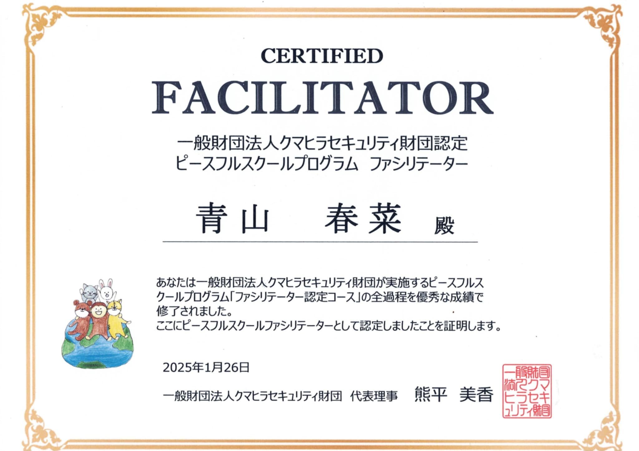 NPO法人WinWin育成協会では、ピースフルスクールプログラム(PSP)を日本に導入された熊平美香先生との連携にて、ピースフルスクールプログラムの公式資格「PSP認定ファシリテーター」と、保護者など大人に伝えるための「PSP認定トレーナー」の養成をおこなっています。